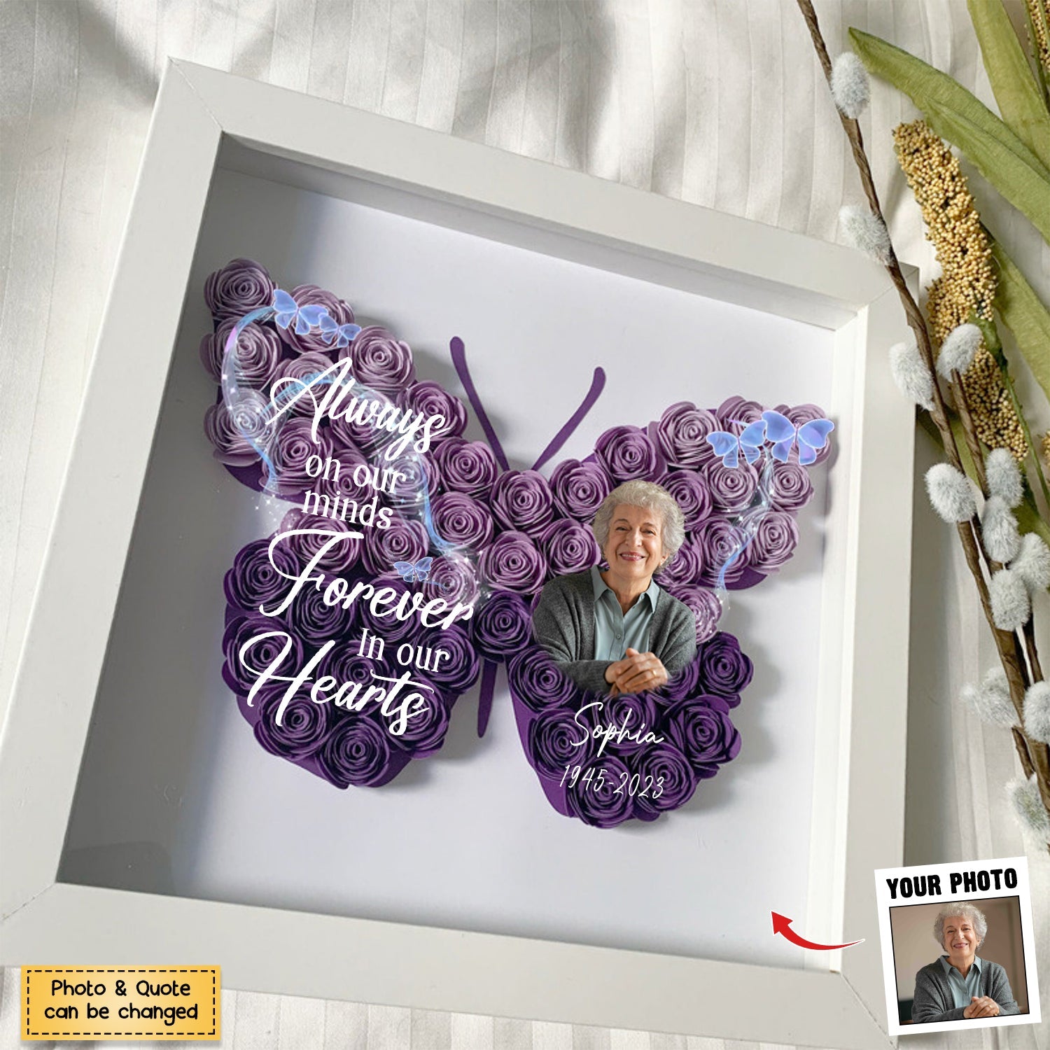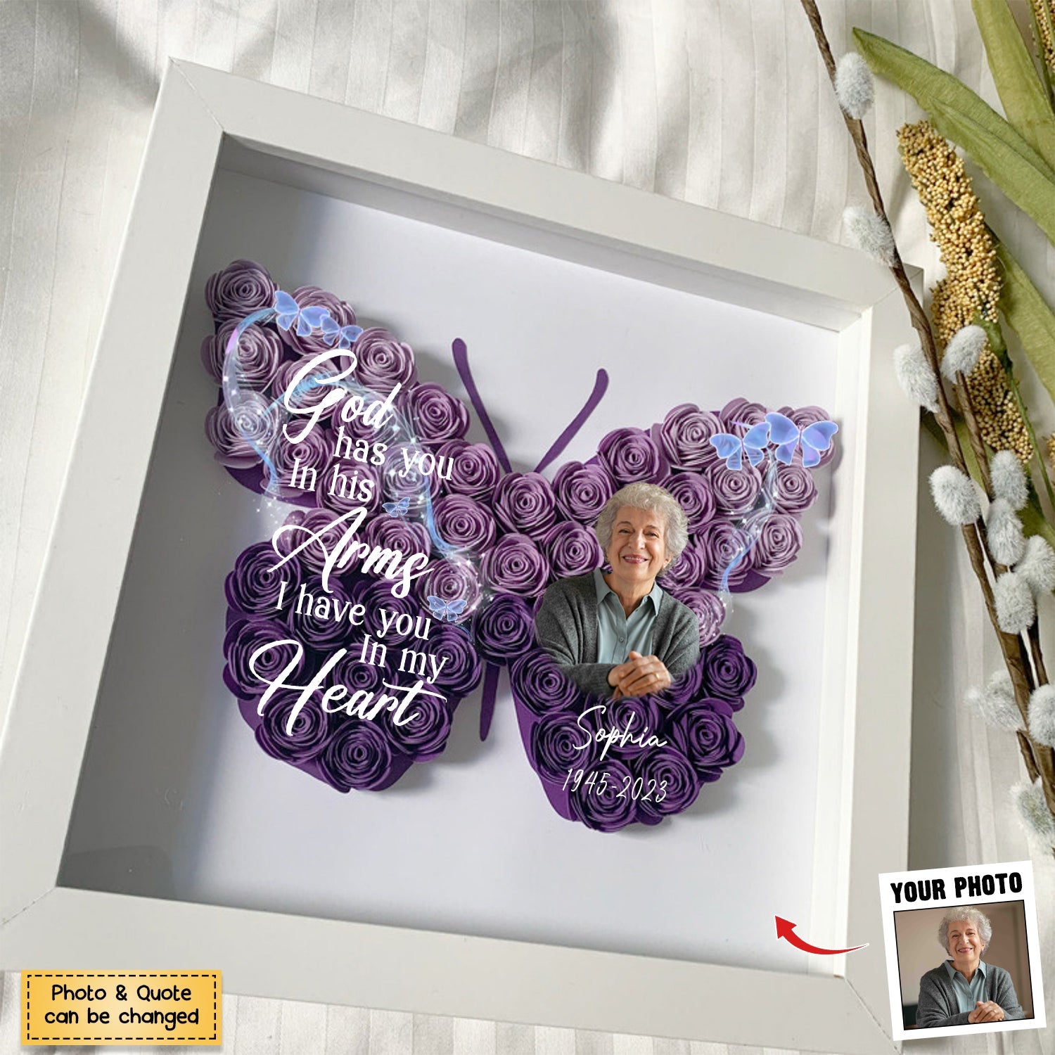 With our Personalized Butterfly Memorial Flower Shadow Box, you can save your best memories. Include treasured images and words in your present to make a lasting remembrance that your loved one will cherish.